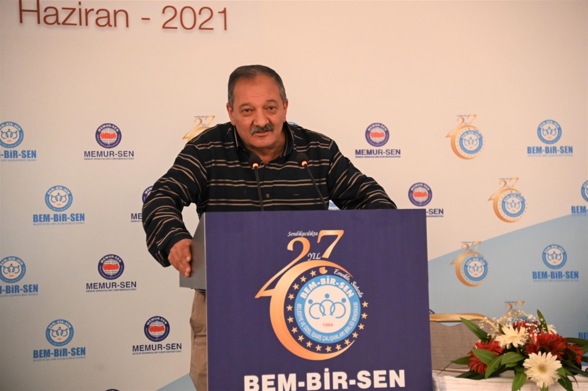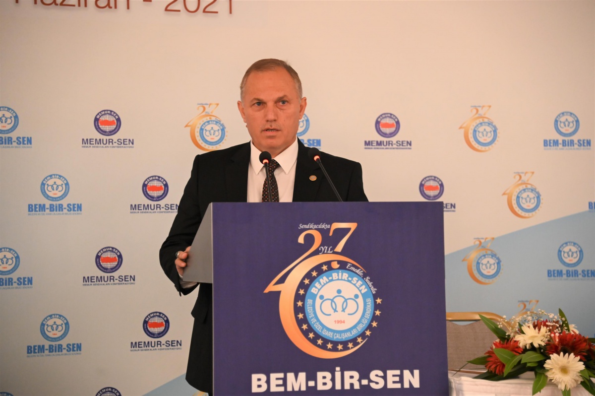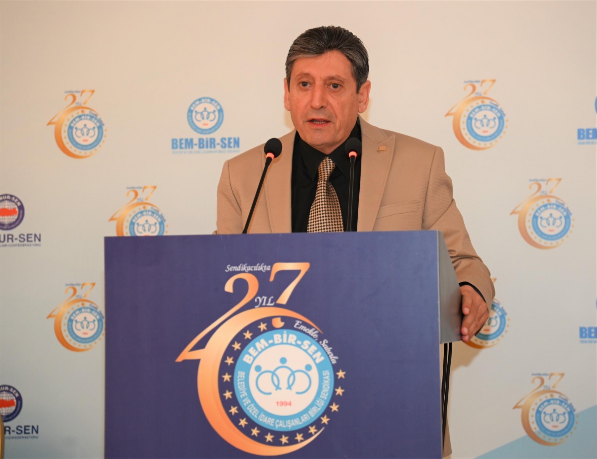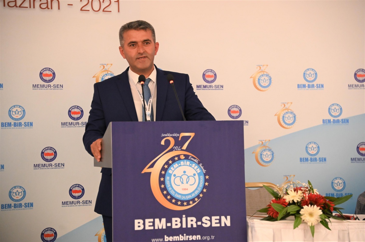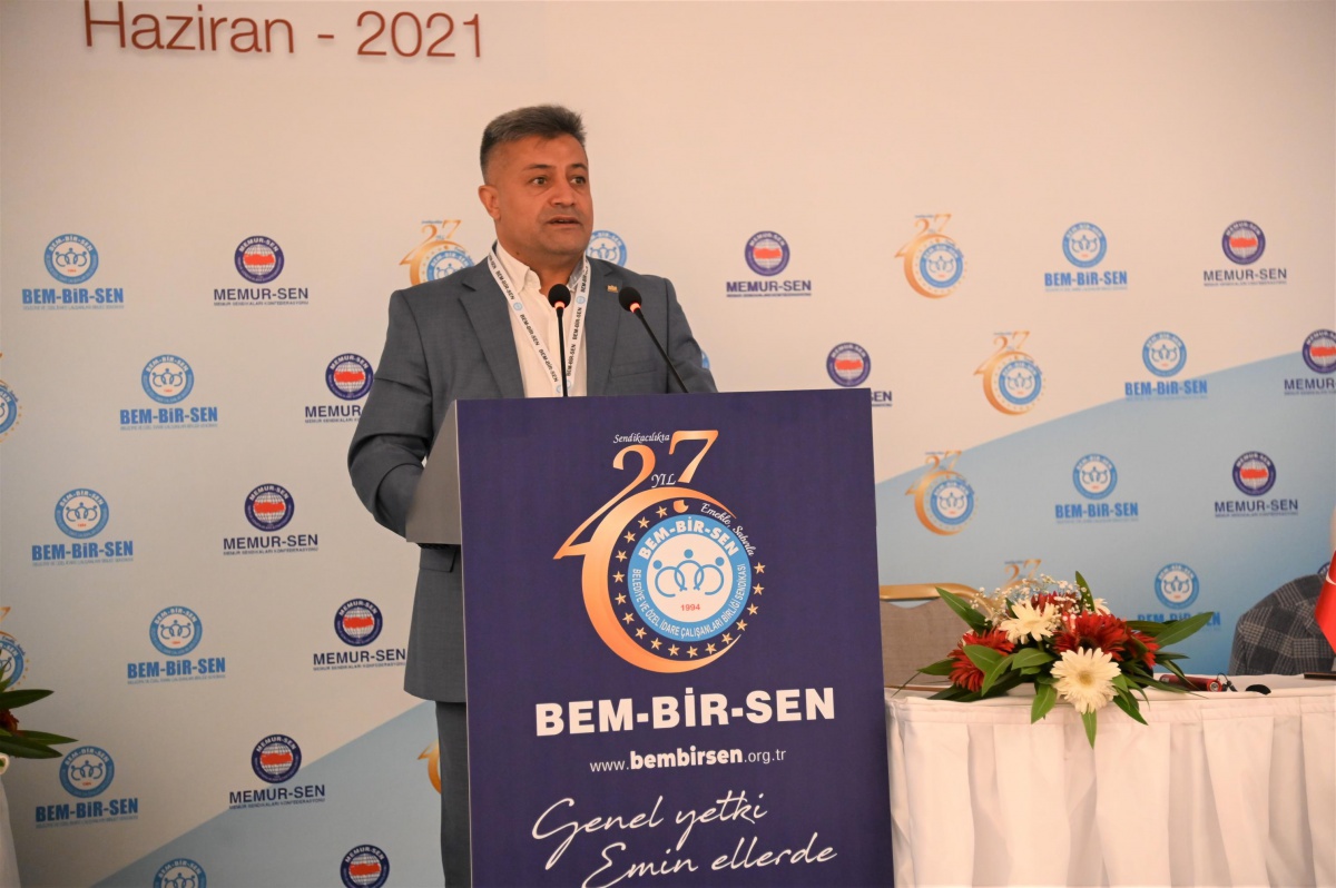 Son iki yıl büyük bir mücadele ile geçti. Bu konuda ben Memur-Sen Konfederasyonu Genel Başkanımız ve Memur-Sen Konfederasyonuna üye bütün sendikalarımıza bu eylemlerde bize destek verdiği için ve bütün eylemlerin kararı ve icrasında bize destek verdiği için Memur-Sen Konfederasyonu Genel Başkanımız Ali Yalçın’a şükranlarımız sunuyorum.Sendikacılığın haysiyetine, emeğin izzetine, emekçinin onuruna yakışan, Yerel Yönetim çalışanlarımızın sorumluluğunu omuzlarında hissederek, almış olduğu kazanımların yanı sıra emekçinin hakkını koruyan sendikanın adıdır;