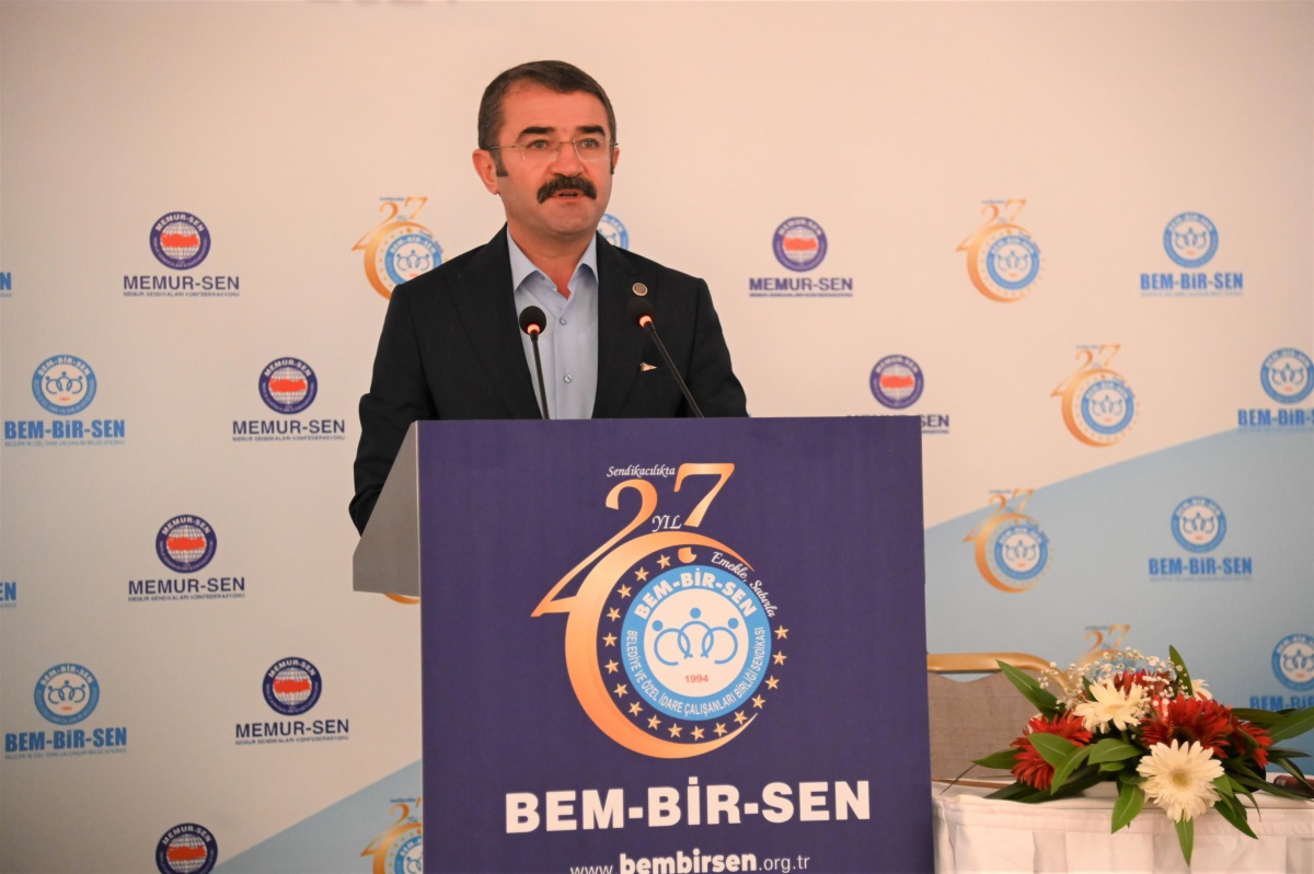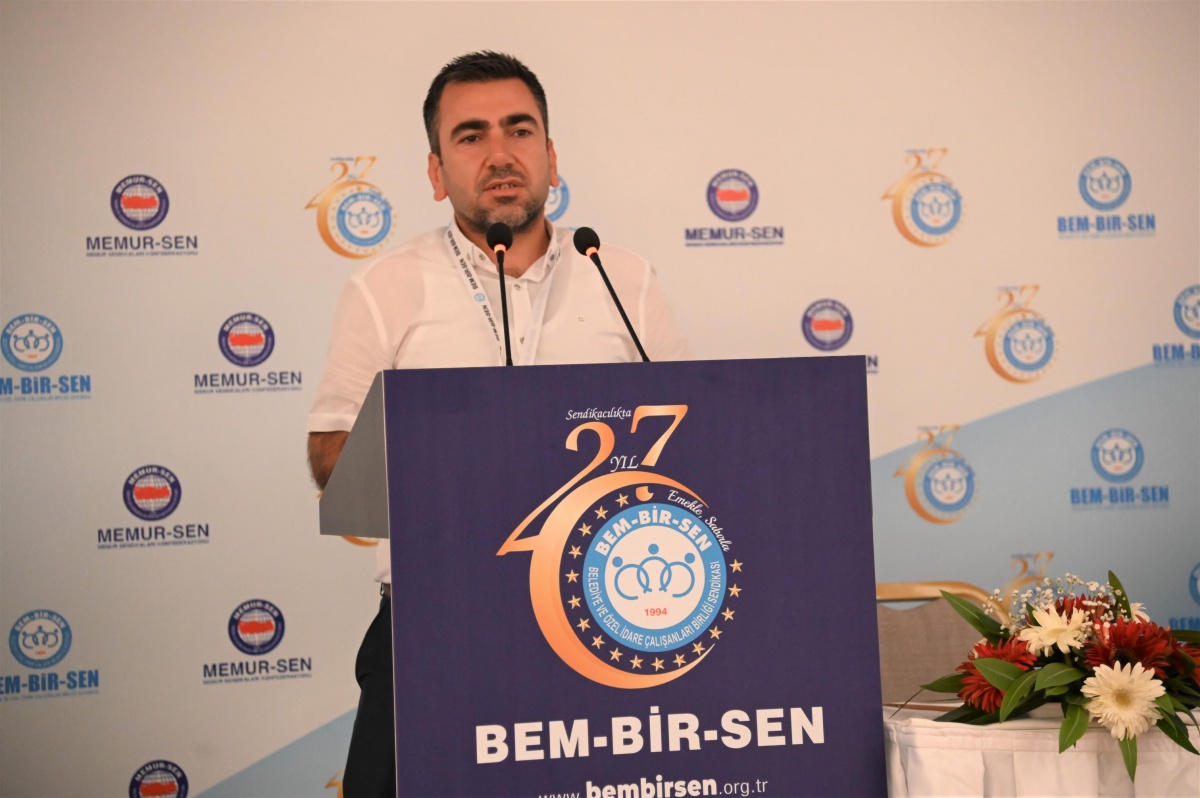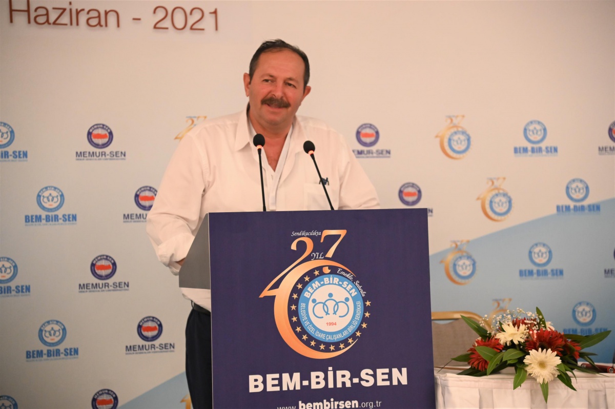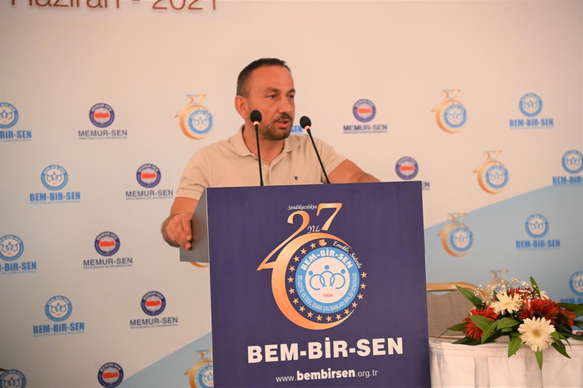 “Bem-Bir-Sen’imizin 27 yıllık mücadele tarihinin son iki yıl içerisindeki eylemselliği 25 yıldan daha fazladır.” ifadelerini kullanan Memur-Sen Genel Başkanımız Yalçın, “Son iki yılda en büyük stresle yüzleşiyorsunuz. Son iki yıl içerisinde yerel yönetimlerin el değiştirmesiyle yıldırmalar, mobbingler, sürgünler ve entikalarla yüz yüze geliyorsunuz. Direyetli ve güçlü bir teşkilat olarak, bu kadar saldırıya, bu kadar yıldırmaya, baskıya, zulme, sürgüne rağmen, adam gibi duran, yel kayadan ne götürür deyip, cüssesini koruyan bir teşkilat burası, bu teşkilatın lider kadrosunu yürekten selamlıyorum. Biz birbirimize tutunmak zorundayız. Beraber hareket etmek durumundayız.5 yıl içinde en fazla üye kaydı yaptığı halde en fazla yıldırma, mobbing, baskı, zulümle yüzleşen bir teşkilat olarak böyle zor zamanda bu kadar üye yapmak. Her adamın işi değil, Er adamın işi. Onun için herkesi yürekten kutluyorum.” dedi.