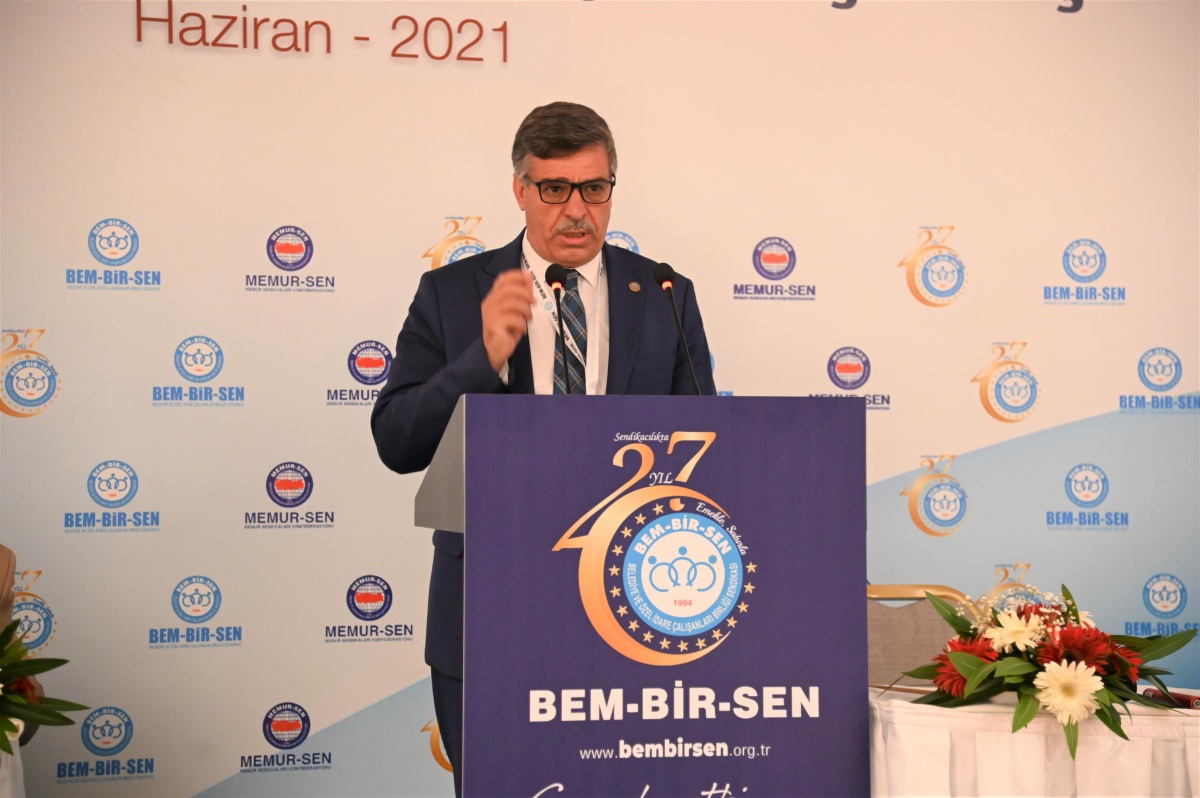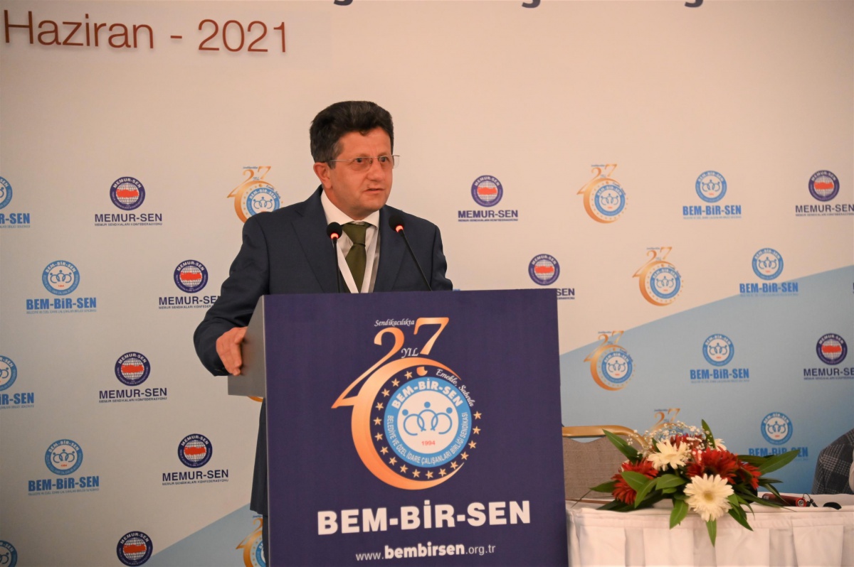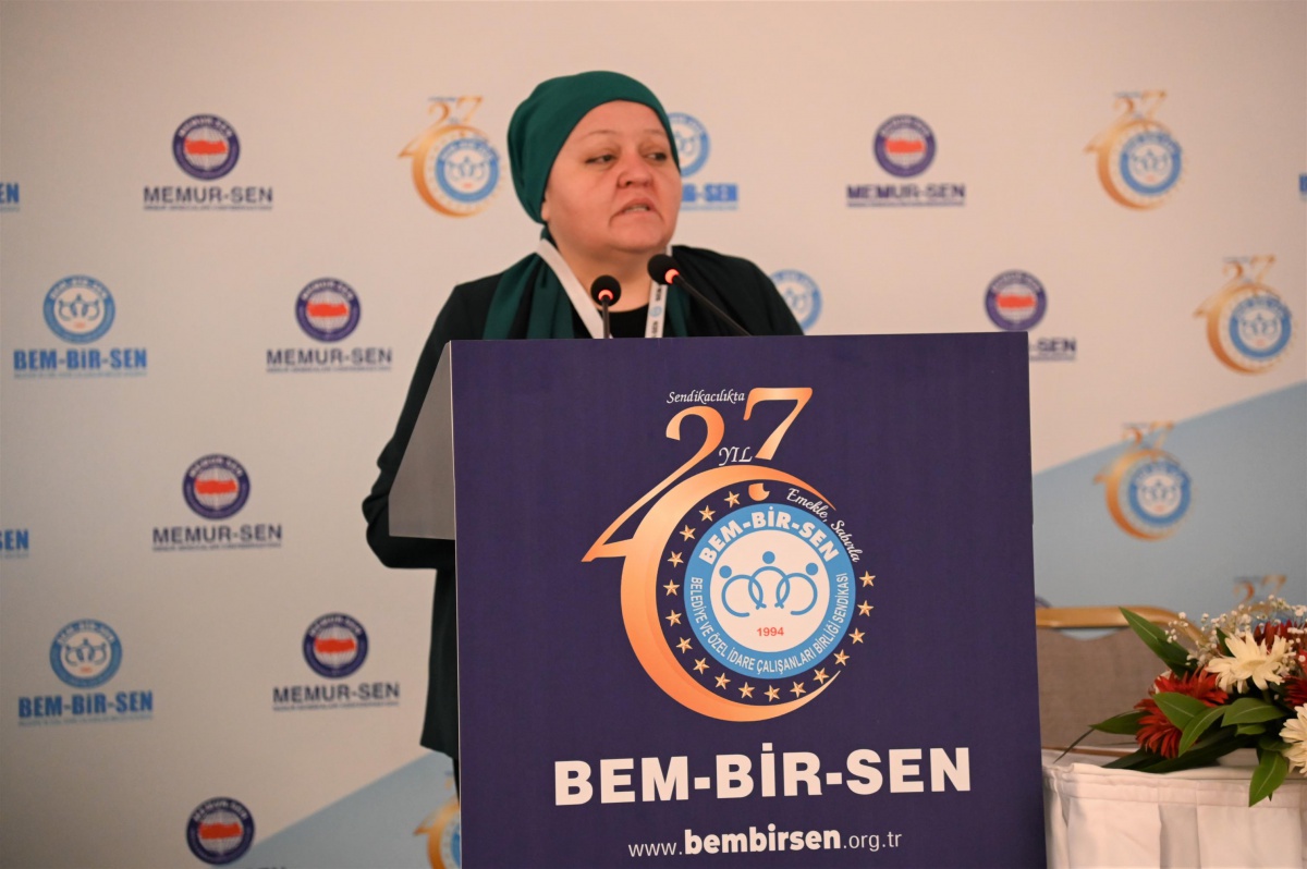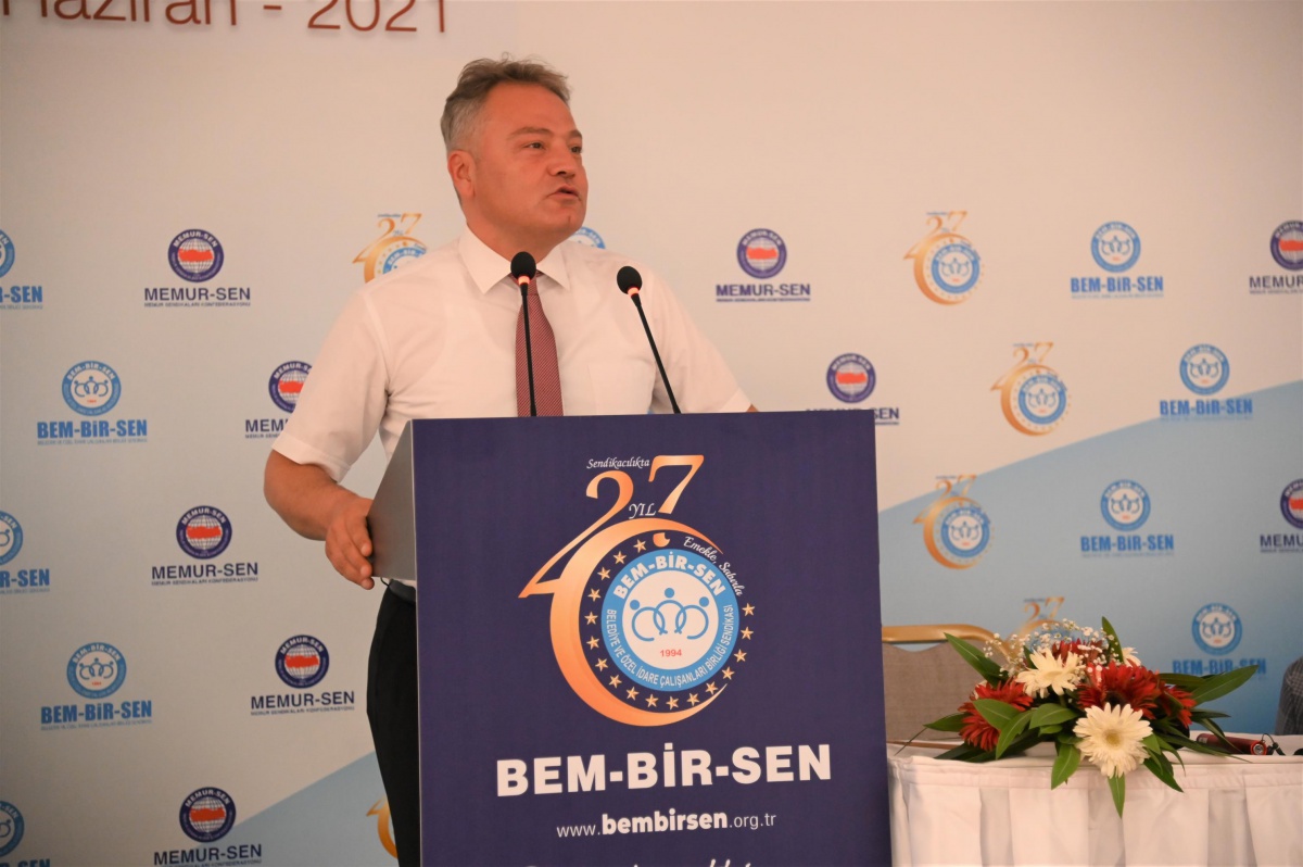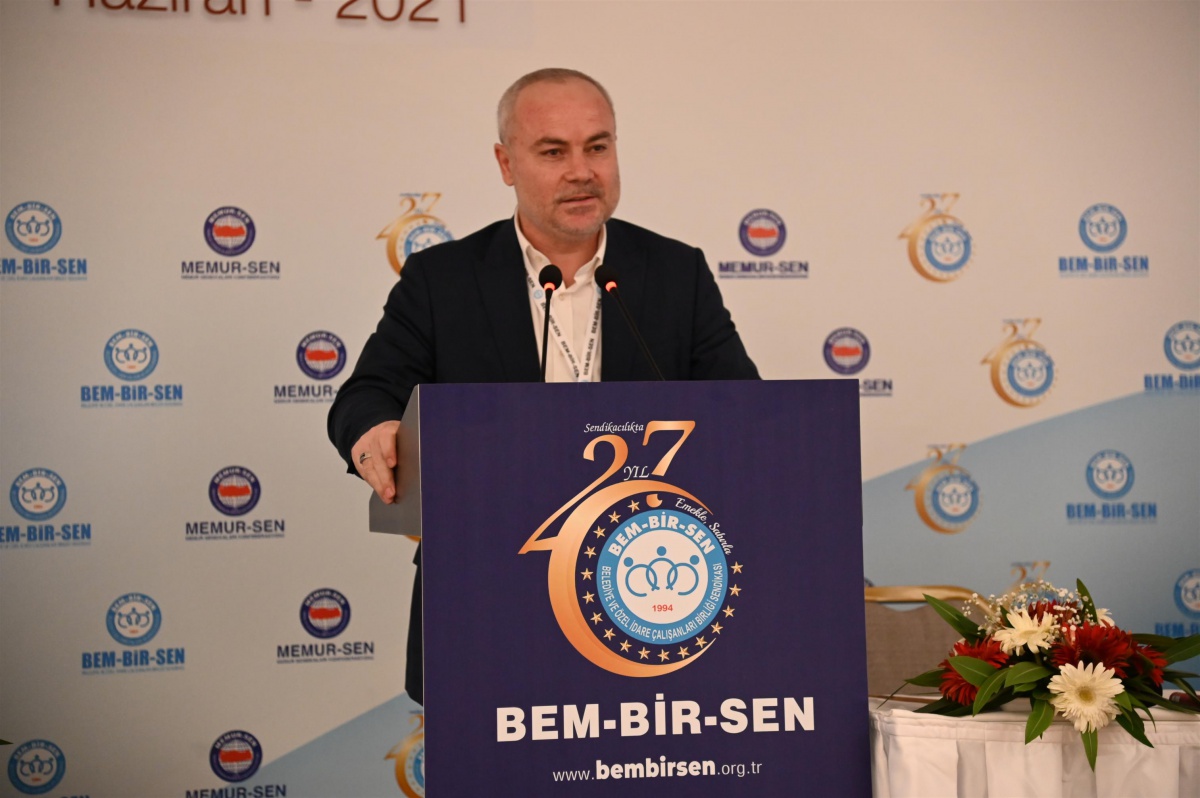 “Bem-Bir-Sen’imizin 27 yıllık mücadele tarihinin son iki yıl içerisindeki eylemselliği 25 yıldan daha fazladır.” ifadelerini kullanan Memur-Sen Genel Başkanımız Yalçın, “Son iki yılda en büyük stresle yüzleşiyorsunuz. Son iki yıl içerisinde yerel yönetimlerin el değiştirmesiyle yıldırmalar, mobbingler, sürgünler ve entikalarla yüz yüze geliyorsunuz. Direyetli ve güçlü bir teşkilat olarak, bu kadar saldırıya, bu kadar yıldırmaya, baskıya, zulme, sürgüne rağmen, adam gibi duran, yel kayadan ne götürür deyip, cüssesini koruyan bir teşkilat burası, bu teşkilatın lider kadrosunu yürekten selamlıyorum. Biz birbirimize tutunmak zorundayız. Beraber hareket etmek durumundayız.5 yıl içinde en fazla üye kaydı yaptığı halde en fazla yıldırma, mobbing, baskı, zulümle yüzleşen bir teşkilat olarak böyle zor zamanda bu kadar üye yapmak. Her adamın işi değil, Er adamın işi. Onun için herkesi yürekten kutluyorum.” dedi.
