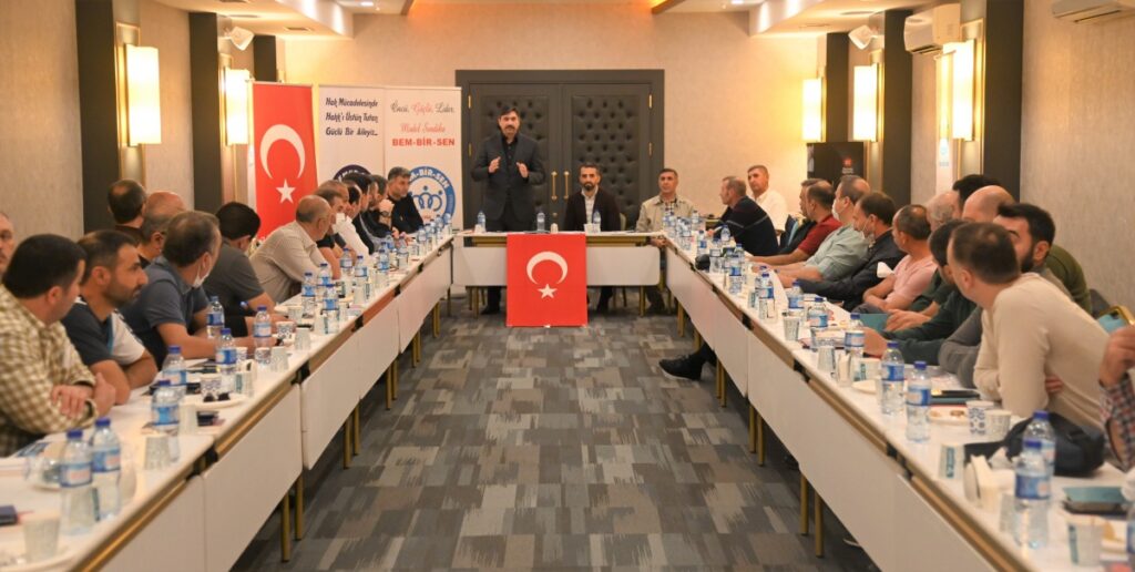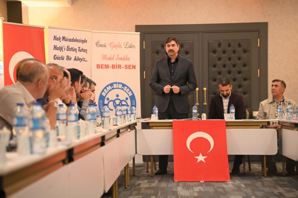 İstiklal Marşı ve Kuran-ı Kerim tilaveti ile başlayan programda, 6. Dönem Toplu Sözleşme’nin Bem-Bir-Sen açısından tarihi kazanımlar ve başarılar içerdiğini ifade eden Genel Başkanımız Uslu, “Genel Yetkili Sendika olarak Yerel Yönetim Hizmet Kolunda çalışan 125 bin Memurumuzun sorumluluğu ve teşkilatımızdan aldığımız güçle bir toplu sözleşme dönemini daha büyük bir tecrübe, istişare ve emekle; sahada ve masada mücadele ederek ortaya koyduğumuz irade sonucunda, genelde ve hizmet kolu sözleşmemizde yerel yönetim çalışanlarımızı ilgilendiren 58 kazanımla Üyelerimizin haklı gururu olduk. Büyük ve güçlü Bem-Bir-Sen Ailemiz; teşkilatımızın duruşu, dirayeti, mücadelesi ve kararlılığıyla bütün takdirleri hak etmektedir. Türkiye sevdamızla, Üyelerimizin haklarını almak ve kazanımlarımızı artırmak görev ve şuuruyla mücadelemize devam edeceğiz. 6. Dönem Toplu Sözleşmesi Kamu Görevlilerimize Hayırlı ve Bereketli Olsun. Toplantımız hayırlara vesile olsun.” şeklinde konuştu.