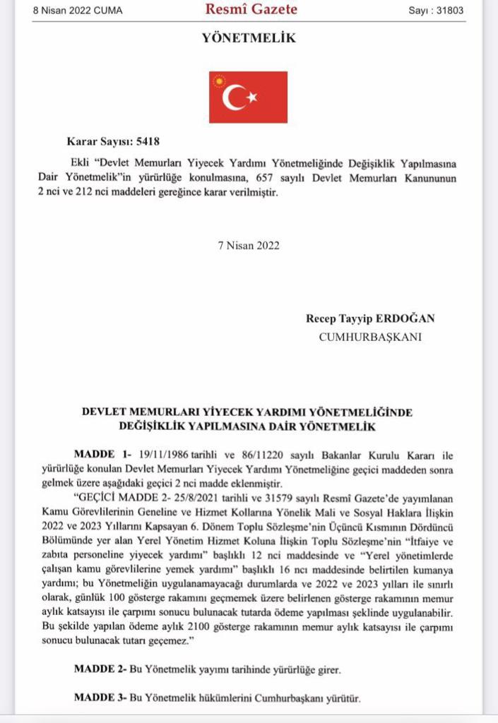 Yerel Yönetim Hizmet Kolu’nun yetkili sendikası Bem-Bir-Sen olarak, 6.Dönem Toplu Sözleşme sürecinde imza attığımız önemli bir kazanım olan ‘Yemek Yardımı’nın karşısındaki bütün engeller Resmi Gazete’de yayınlanan düzenleme ile kaldırıldı.
